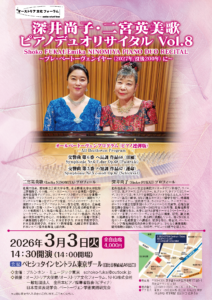 3月3日(火)平日ですが、午後2時から、恒例の日比谷、ベヒシュタインセントラム東京ザールで、第8回目になる、「深井尚子・二宮英美歌 ピアノデュオリサイタル」が開催されます。今回は、前半にベートーヴェンの田園交響曲、後半に運命交響曲という、ベートーヴェンのもっとも有名な交響曲を2曲、演奏します。ピアノデュオによるオーケストラの壮大さを感じていただけましたらうれしいです。