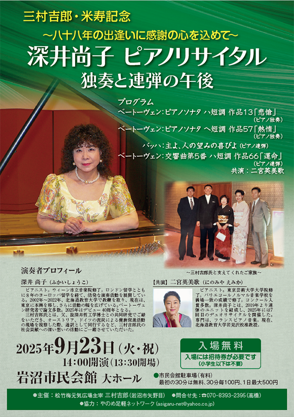 今回は、三村さんの米寿記念と感謝の心をこめた演奏会となっており、プログラムは、ベートーヴェンのピアノソナタ(深井ソロ)とベートーヴェンの「運命」交響曲のピアノ連弾版(長年の相棒の二宮英美歌さんとの共演)を演奏します。