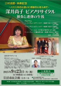 三村吉郎・米寿記念 ~八十八年の出会いに感謝の心をこめて~ 深井尚子 ピアノリサイタル 独奏と連弾の午後