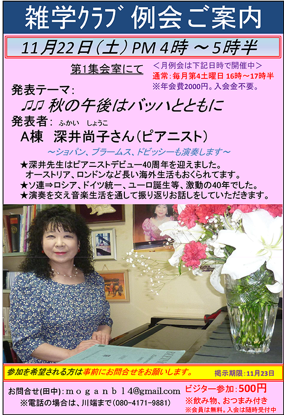 11月22日は、サンシティ内の第1集会室で、ロマン派、印象派の音楽を演奏しながら、半世紀にわたる私の音楽生活と社会情勢の変化を日本とヨーロッパの両面からお話します。